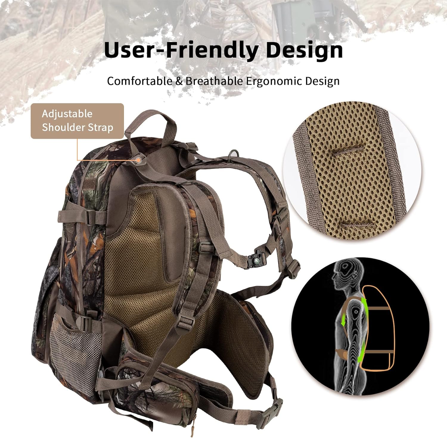 - Ergonomic Design:Expandable pocket to carry your gun or compound bow securely, and an adjustable torso system, you can comfortably carry your hunting essentials, padded shoulder straps, a padded cool mesh back, an adjustable sternum strap and a waist belt,decompressed,breathable and comfortable.