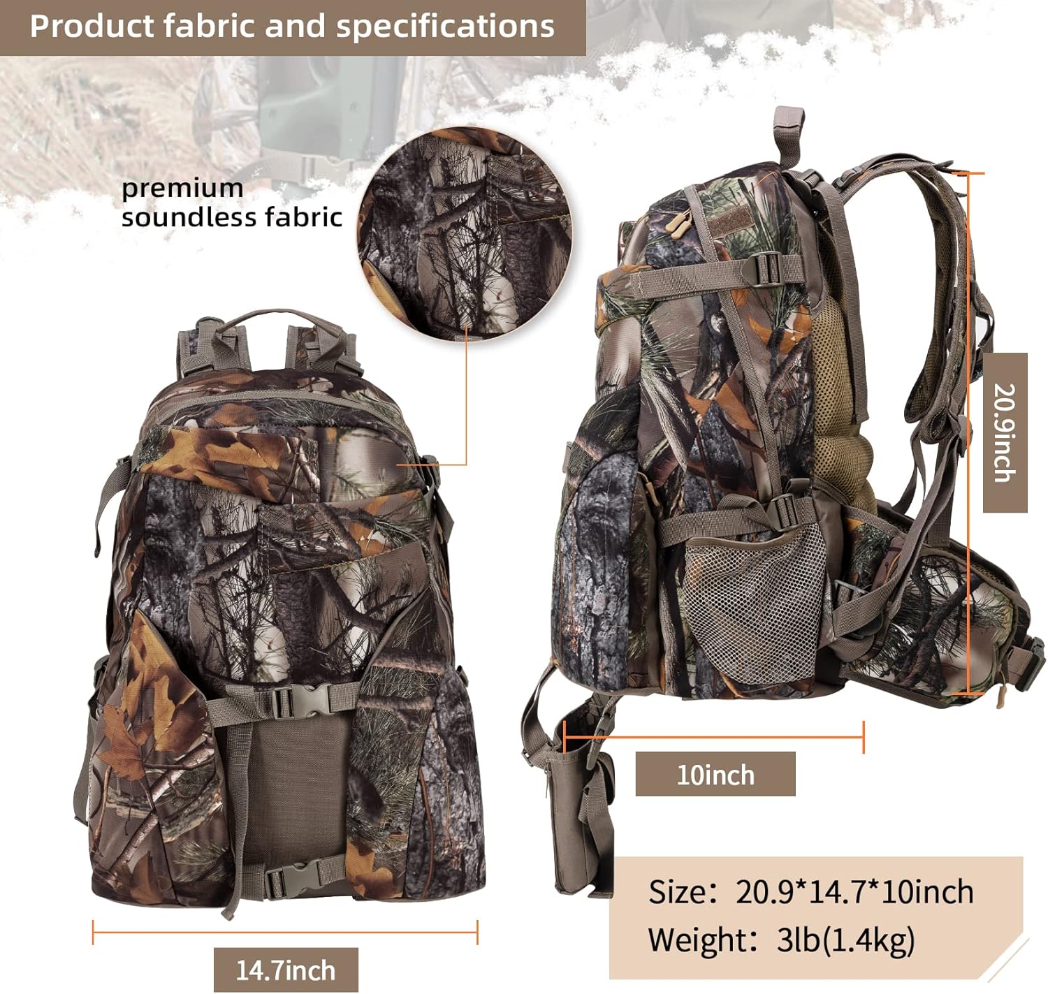 - Hunting Conducive:BLISSWILL hunting Backpack made of waterproof premium soundless fabric,to give hunters quick, quiet access to gear.precise stitching,lightweight and durable.Camo pattern:maximum camouflage during hunting.Size:20.9*14.7*10inch.Weight:1.4kg.
